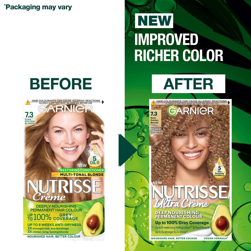 Garnier Nutrisse Ultra Crème Permanent Hair Dye, Up to 100% Grey Coverage, 8-weeks Long-Lasting Colour, No Ammonia, Vegan (Shade: 7.3 Dark Golden Blonde)