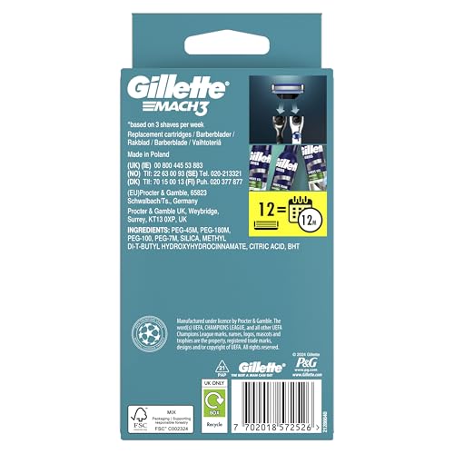 Gillette Mach3 Razor Blades Men, 12 Razor Blade Refills, Compatible with Gillette Mach3 Razors for Men