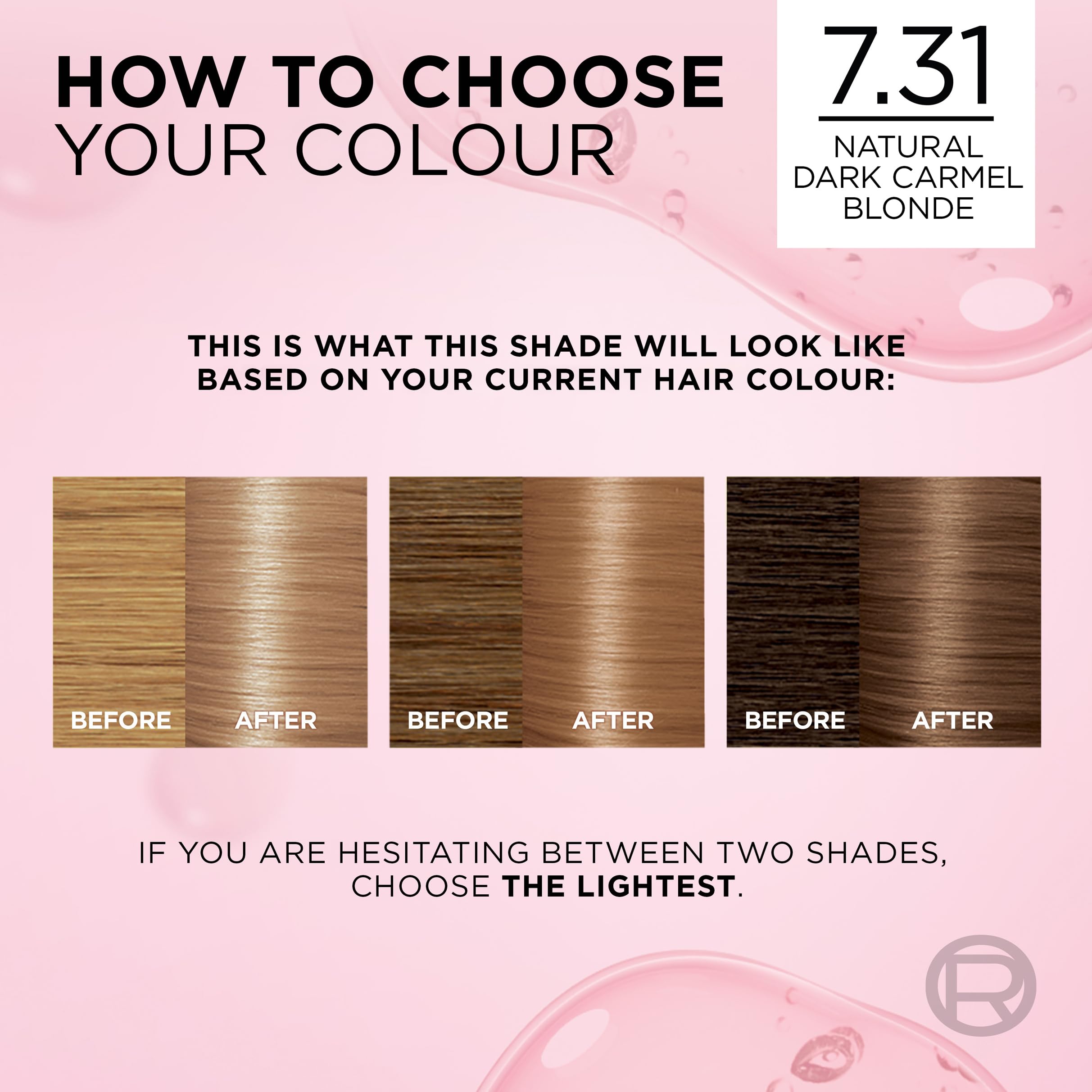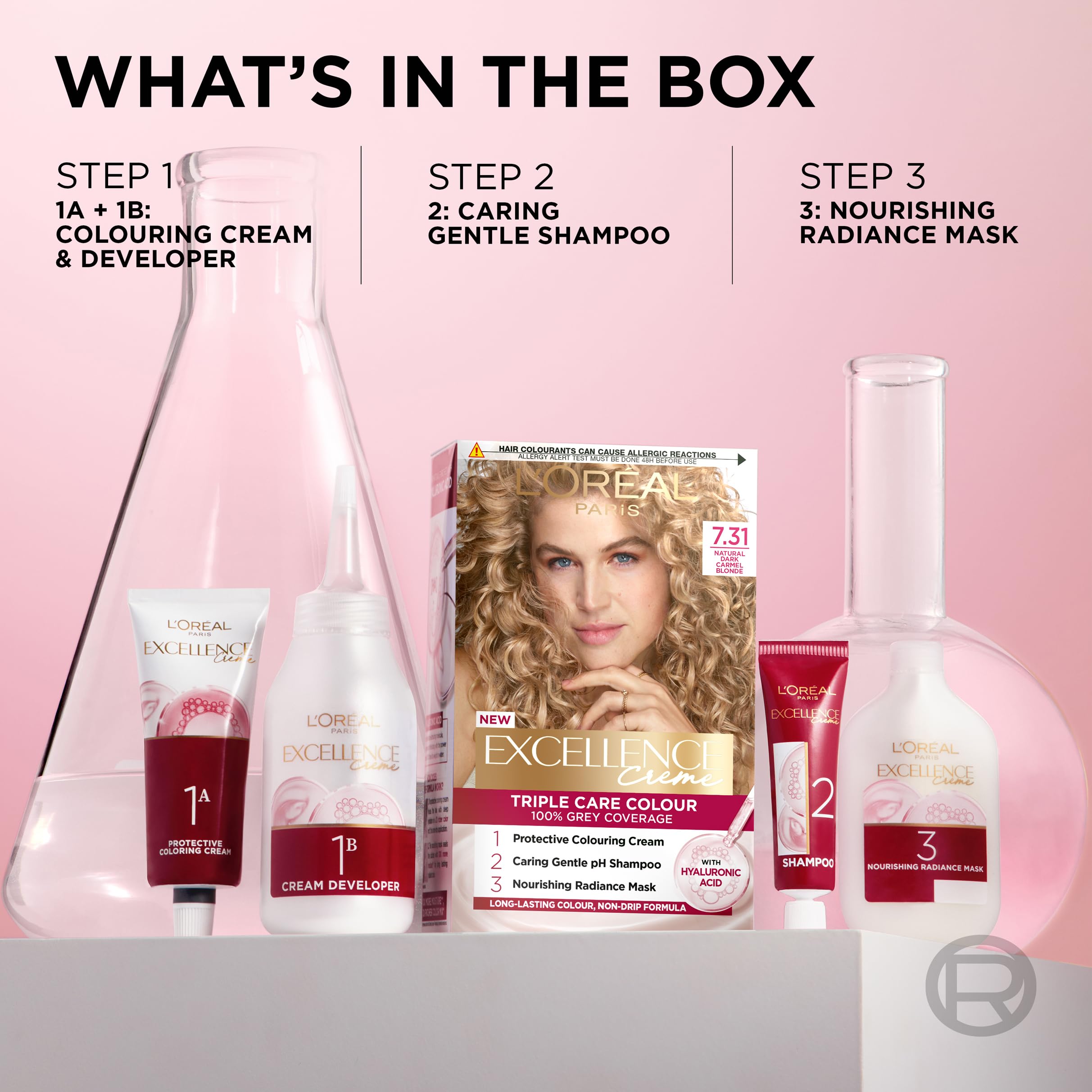 L’Oréal Paris Excellence Crème Permanent Hair Dye, Radiant At-Home Hair Colour with up to 100% Grey Coverage, Pro-Keratin, Up to 8 Weeks of Colour, Colour: 7.31 Natural Dark Caramel Blonde