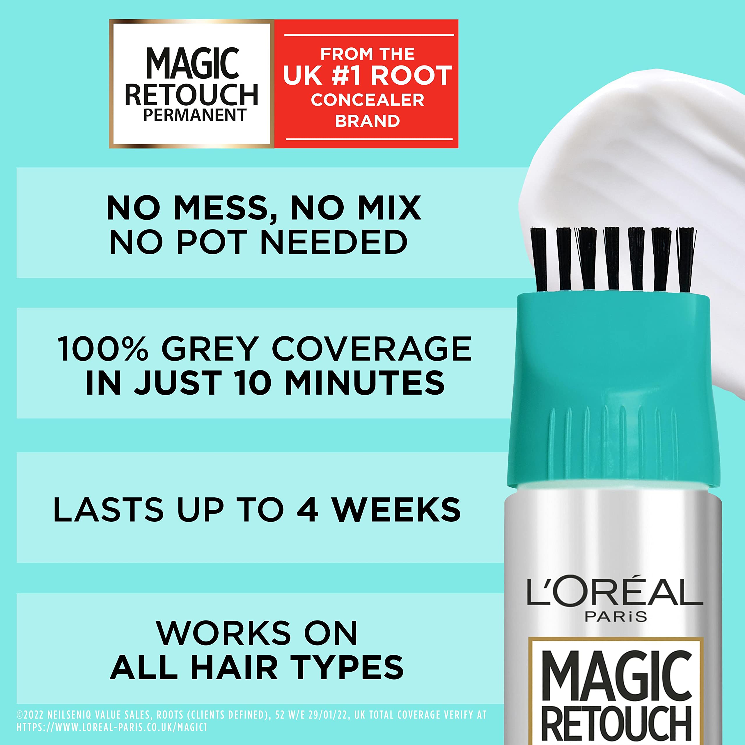 Achieve 100% grey root coverage, that lasts up to 4 weeks, in just 10 minutes with L’Oréal Paris Magic Retouch Permanent Root Concealer in Darkest Brown 3. This long-lasting formula blends seamlessly with your hair color, even a salon one, and leaves hair looking fuller. The easy-to-use applicator brush ensures precise, mess-free application. Suitable for all hair types and textures.