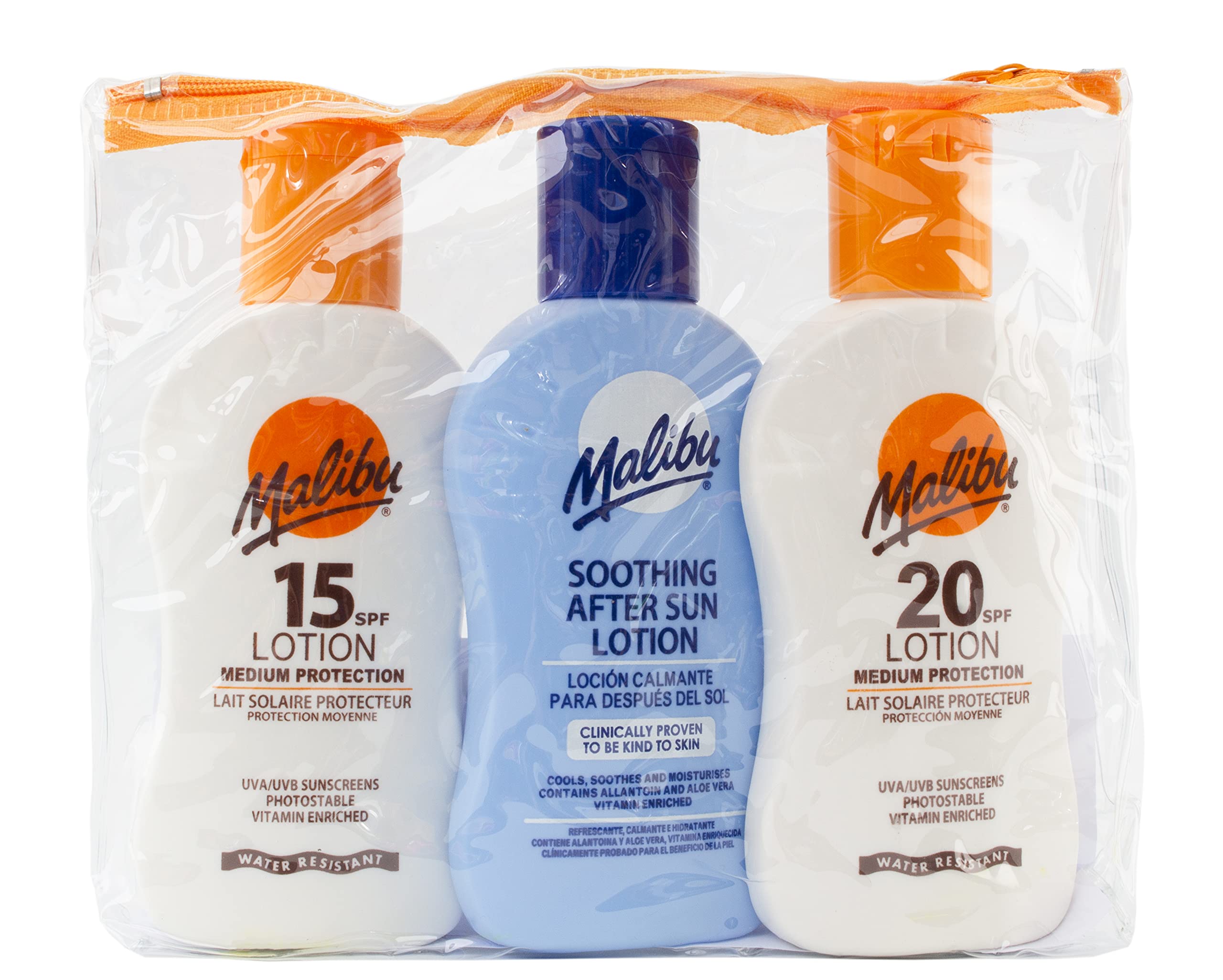 Malibu Sun Travel Essentials with Suncream Protection and Soothing Aftersun Lotion, Water Resistant, SPF 15 and 20, Multipack, 3 x 100ml